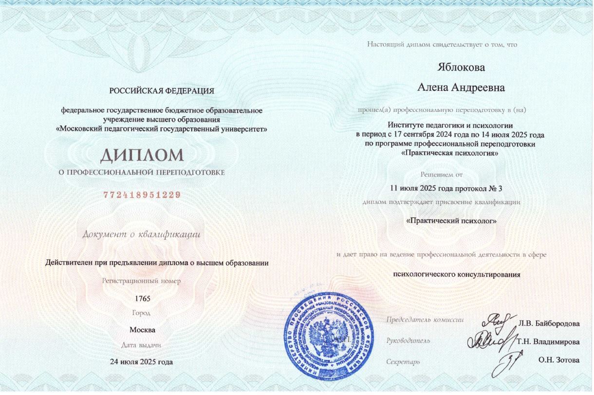 Благодаря моему лингвистическому бэкграунду я постоянно перенимаю зарубежный опыт и прохожу курсы повышения квалификации от практикующих психологов по всему миру.