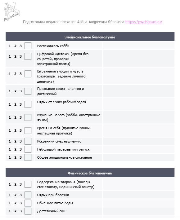 Чеклист личного благополучия поможет вам оценить частоту и качество ухода за собой в пяти важных сферах жизни: